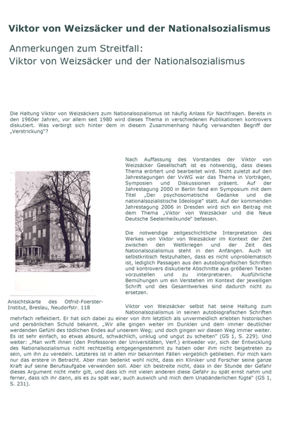 Welche Form von Duldung, Mitwisserschaft und Schweigen ihm zuzurechnen ist, kann nur jeder Sachkundige für sich entscheiden. Ein endgültiges Urteil wird es dazu nicht geben können, da immer mit dem Auftauchen neuer Belege und demzufolge mit einem Wandel der begründbaren Einschätzungen zu rechnen ist. Lange Zeit erschien es z. B. als gesicherte Erkenntnis, dass jener Neuropathologe, H. J. Scherer, im Breslauer Institut völlig unabhängig von V. v. Weizsäcker, seinen übrigen Mitarbeitern und der mit ihnen verbundenen Gestaltkreis-Forschung gearbeitet hat. Erst durch die Recherchen von W. Rimpau konnte in Erfahrung gebracht werden, dass V. v. Weizsäcker ihn als Wissenschaftler persönlich schätzte, sich für eine seiner Buch-Veröffentlichungen einsetzte und auch von seiner sozialistischen Überzeugung wusste. Auch in diesem Zusammenhang stellen sich viele, derzeit nicht sicher beantwortbare Fragen (beispielsweise, ob H. J. Scherer mit V. v. Weizsäcker über die Anzahl und Todesursachen der Kinder in Lubliniec gesprochen hat). Dennoch haben wir die Verpflichtung, uns um noch präziser belegte Antworten zu bemühen. Dazu wollen wir alles uns Mögliche beitragen. Vor diesem Hintergrund würden wir uns über jede Anregung, inhaltliche Kritik und Zustimmung oder gar die Zusendung neuer Belege freuen.